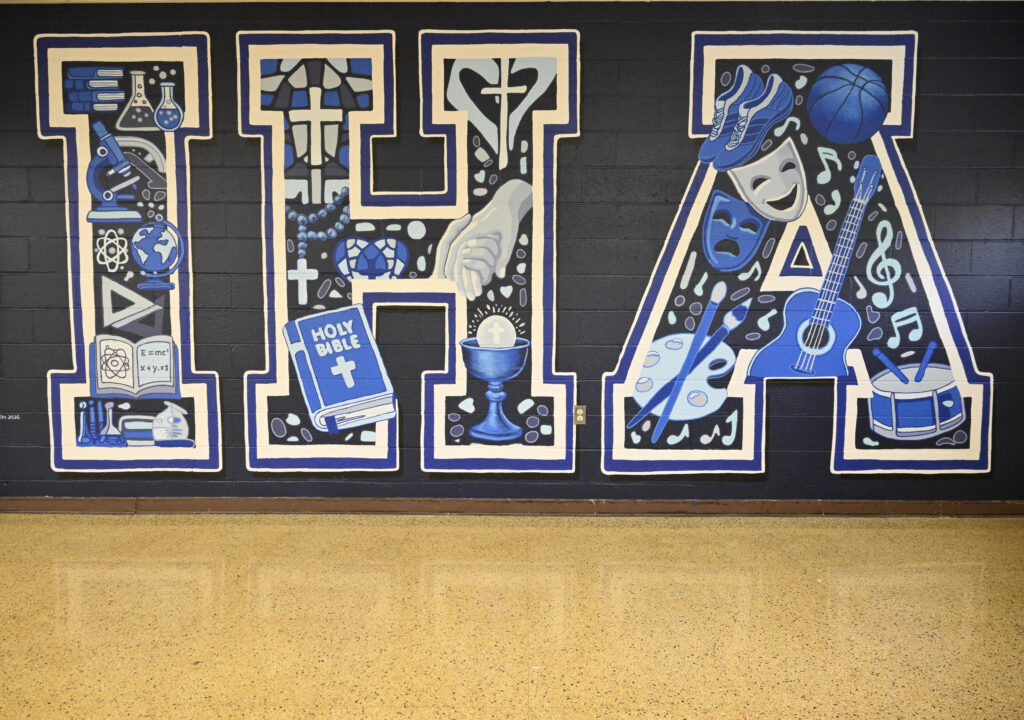 The mural features large IHA letters in a bold Varsity-Style font, representing the spirit and identity of the school. Each letter contains imagery that represents a different aspect of student life at IHA. The “I” represents academics, and within this letter are images symbolizing learning and scholarship. The “H” represents Faith and service, symbolizing IHA’s strong Catholic identity and commitment to service. Finally, the “A” represents activities and student life, which includes various images of athletics, the arts, and extracurricular activities.